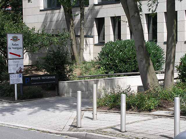 Auf der rechten Straßenseite liegt direkt hinter dem Eingang des Steigenberger Hotels die Einfahrt zu unserer Tiefgarage. An der Einfahrt ziehen Sie sich vor der 1. Schranke ein Ticket.