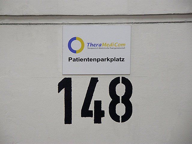 In der Tiefgarage fahren Sie gerade aus, bis zur 2. Schranke. Dort klingeln Sie bei „Theramedicom“ und warten darauf, dass wir Ihnen die Schranke öffnen. Dann fahren Sie die Rampe herunter auf die blaue Ebene, gekennzeichnet durch die blauen Streifen an den Wänden.